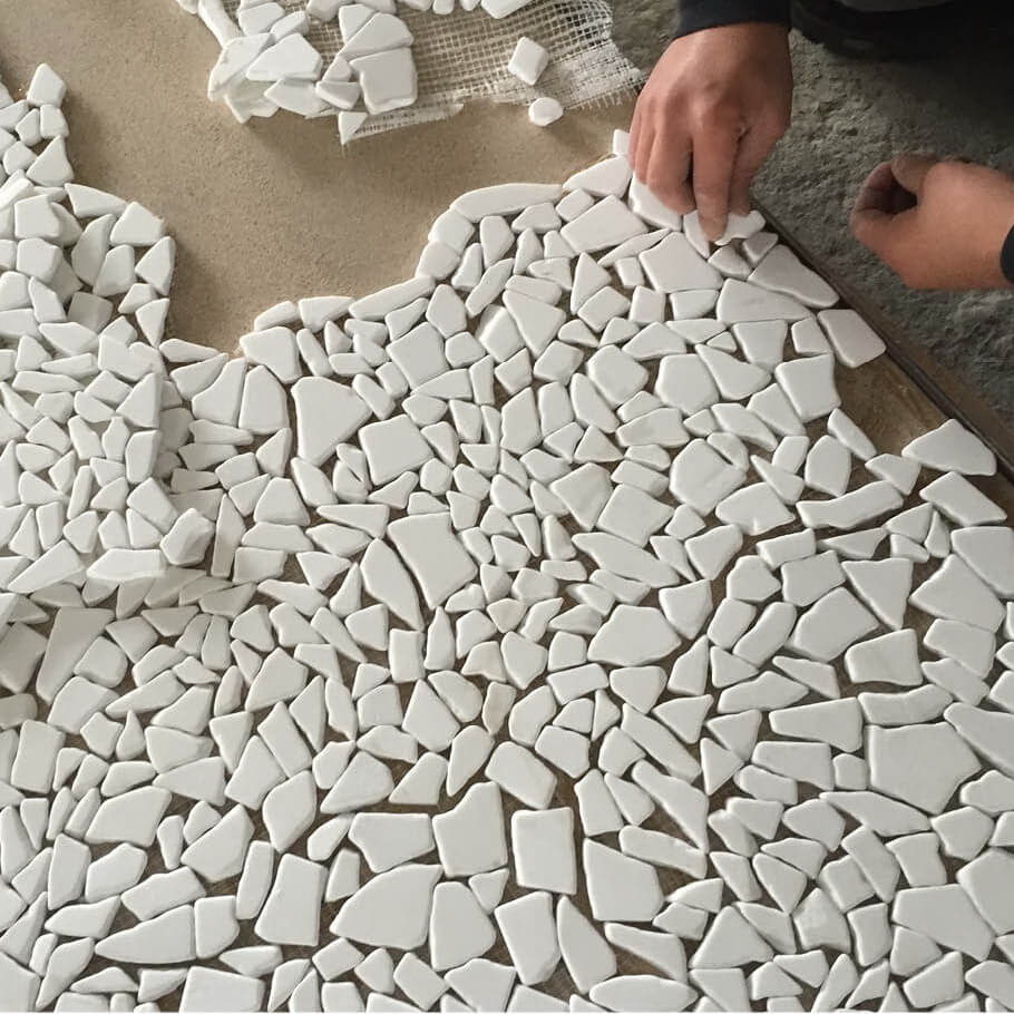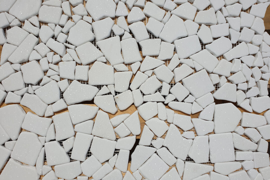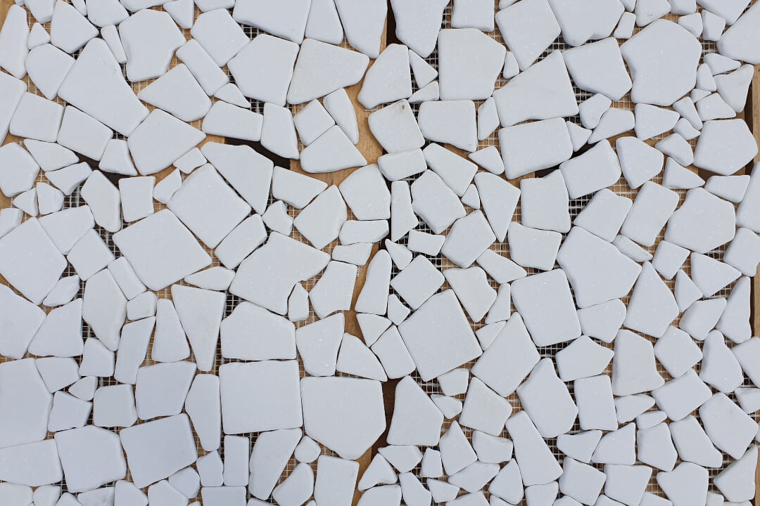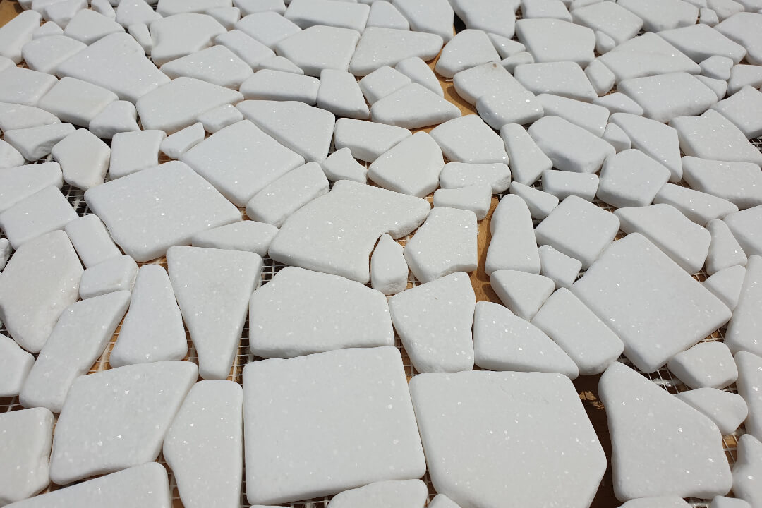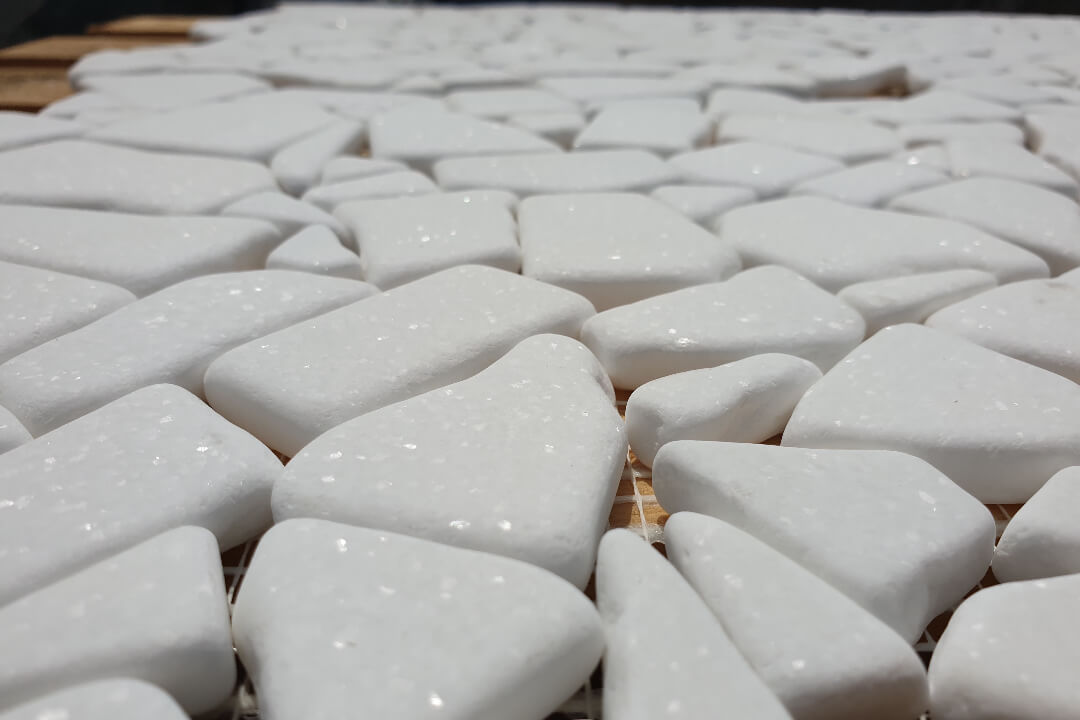 Crystal White Márvány Természetes Kavicsmozaik Kőburkolat. Hófehér 30×30 cm méretű hálós kavicsmozaik burkoló kő. „Zuhanyzótálca” burkolatként különösen ajánlott. Kültérre és beltérre is!