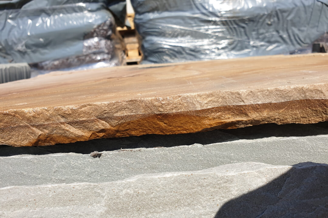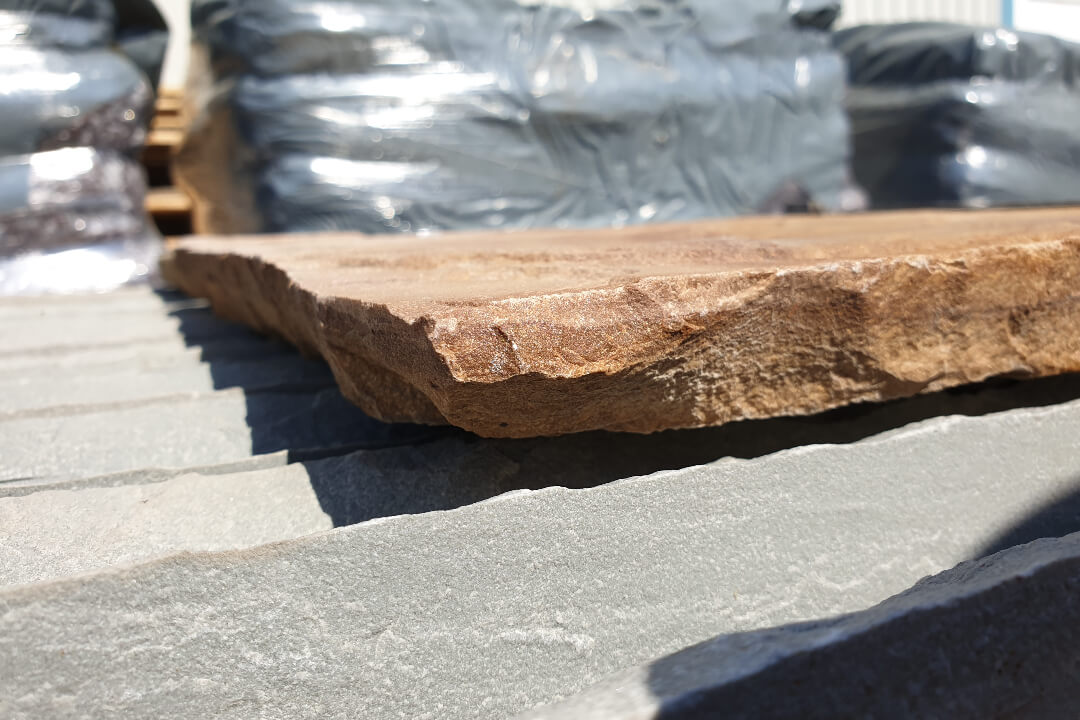 Modak Barna 40×60 cm Homokkő Lépőkő/Kőburkolat. Világosbarna árnyalatú 40×60 cm méretű, 3-5 cm vastag szabályos lépőkő és burkoló kő járófelületre (akár száraz rakással is). Kültérre és beltérre is!