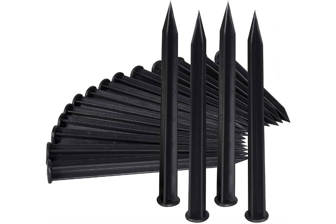 Műanyag Leszúró Tüske – Fekete, 20 cm hosszú. Műanyag Fekete Kerti Szegély (300 cm) rögzítéséhez (40 cm-enként) és Műanyag Fekete Kerti Szegély (100 cm) rögzítéséhez (25 cm-enként).