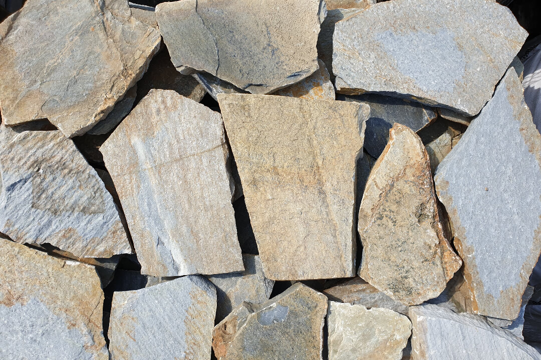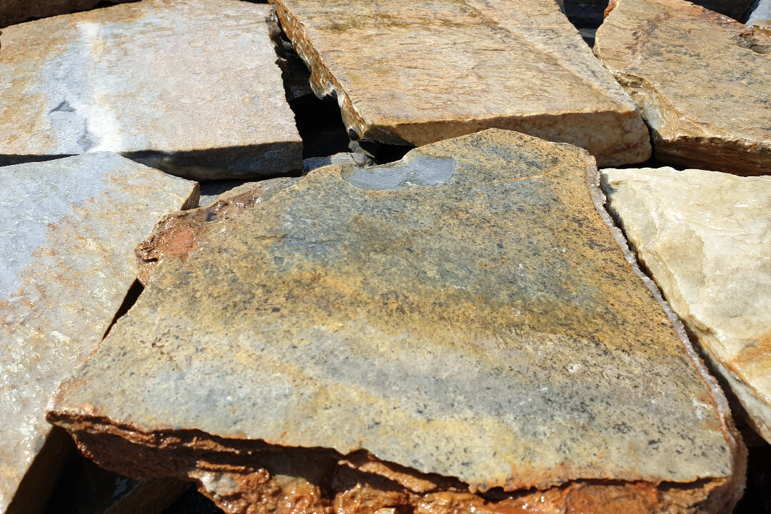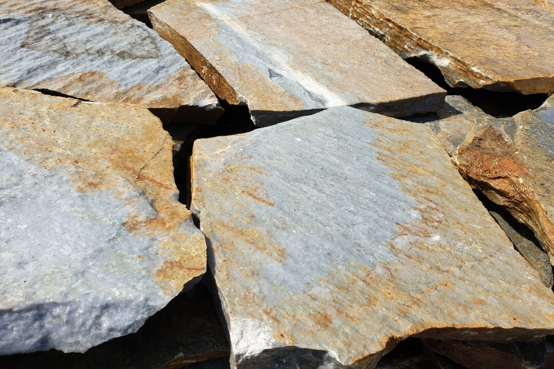 Perla Marina Kvarcit 3-5 cm vastag Természetes Kőburkolat/Lépőkő. Világosszürke-Sárga árnyalatú szabálytalan burkoló kő járófelületre és lépőkőnek. Kültérre és beltérre is!